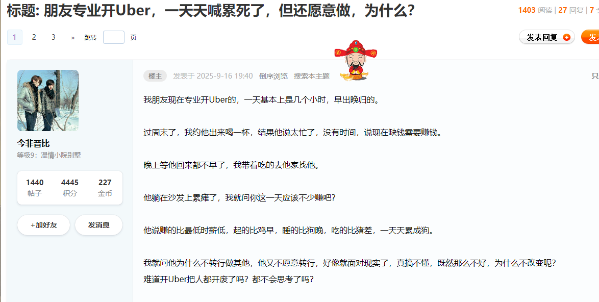 客观地说,如果你有能力找到一份收入更高,哪怕看起来没Uber这么有安全感的工作,还是尽可能把Uber当做兼职、当做灵活补充收入,而不是主要收入。现在的职场状况确实不如意,但毕竟不是世界末日……