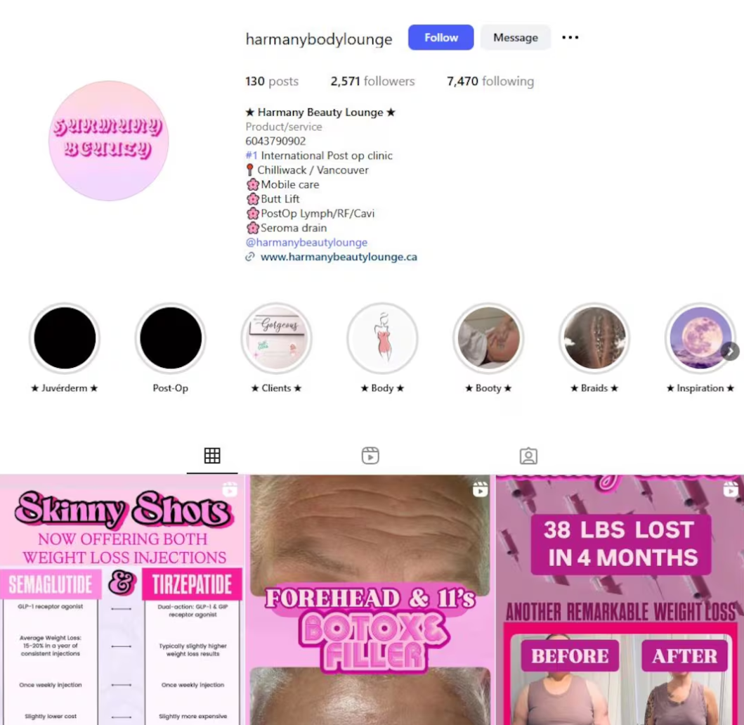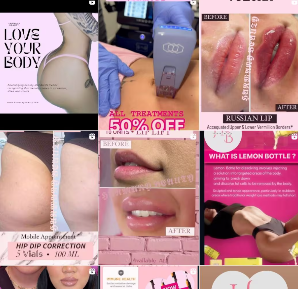 她们使用的账号名称如“Injector Barbie”“Harmany Beauty”等,包装得如同专业医疗美容工作室。